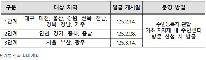 2월14일부터 1단계 지역 : 대구, 대전, 울산, 강원, 전북, 전남, 경북, 경남, 제주 등에서 발급을 개시